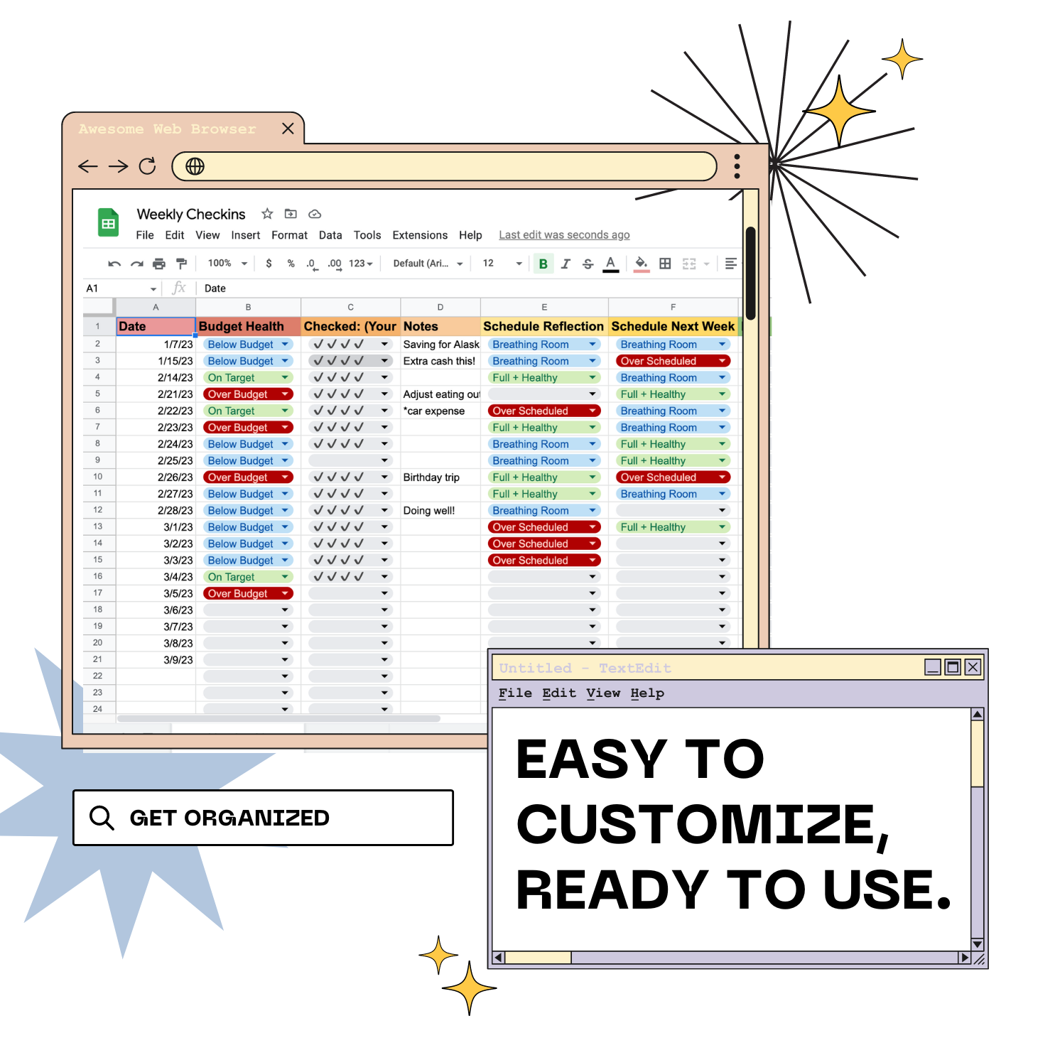 The ultimate tool for a quick weekly check-in to be sure you're on track with your big and small goals to stay organized and get sh*it done.